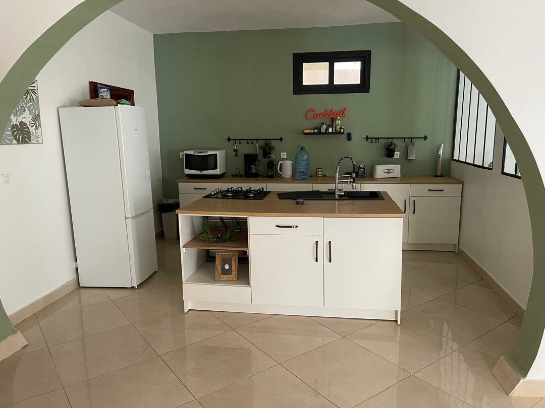 La cuisine indépendante, moderne et fonctionnelle, est dotée d’un îlot central, offrant un espace convivial et pratique pour le quotidien.