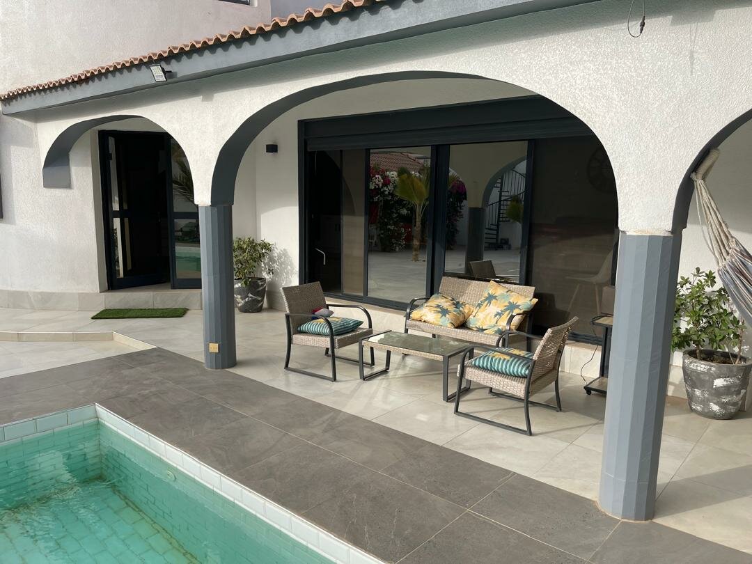 La terrasse couverte, bordant la piscine, propose un espace détente idéal pour profiter de la douceur de Ngaparou.