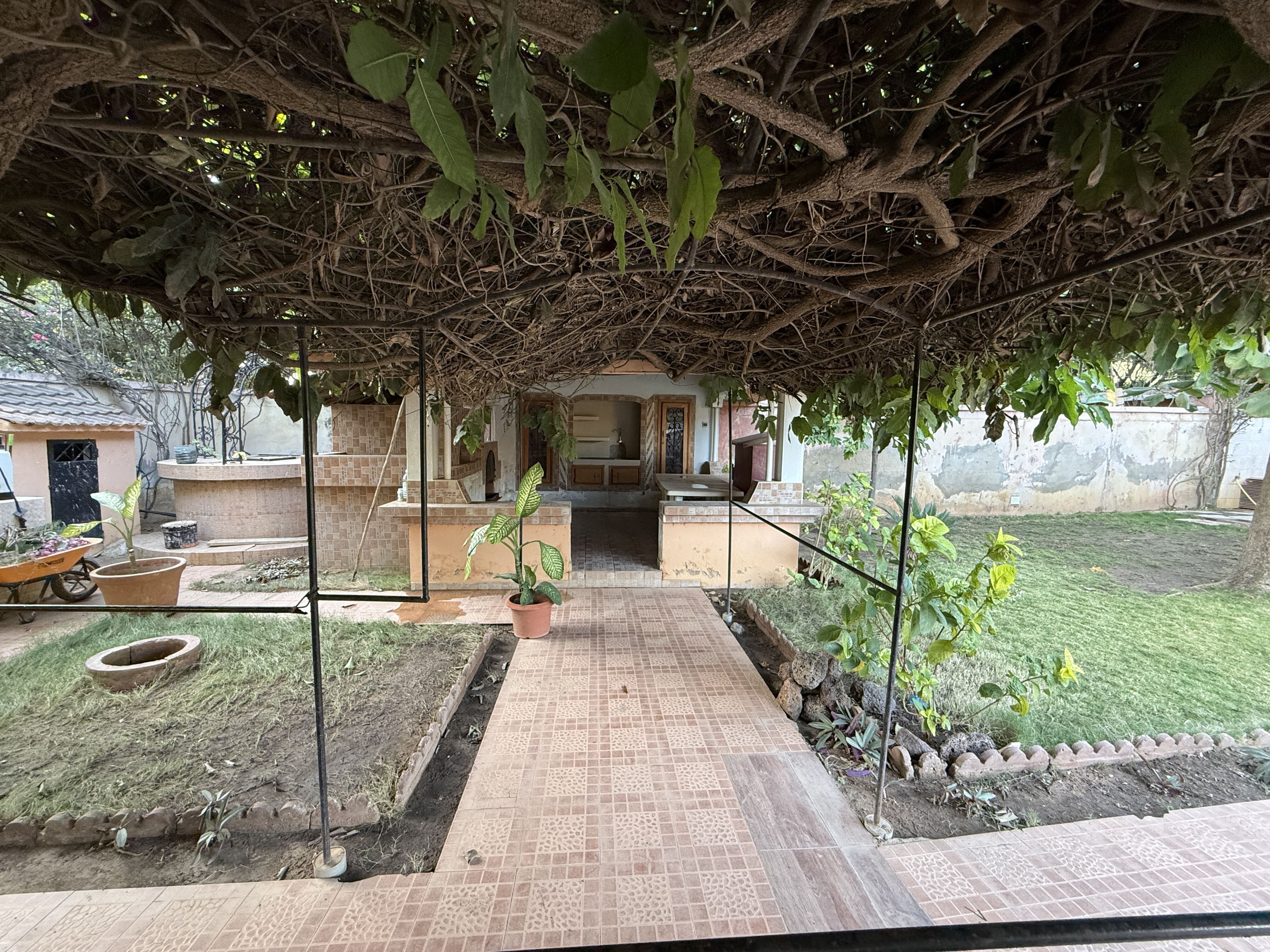Une cuisine extérieure avec four à pizza et four à bois, un logement de gardien, un puits, une réserve d'eau, un surpresseur