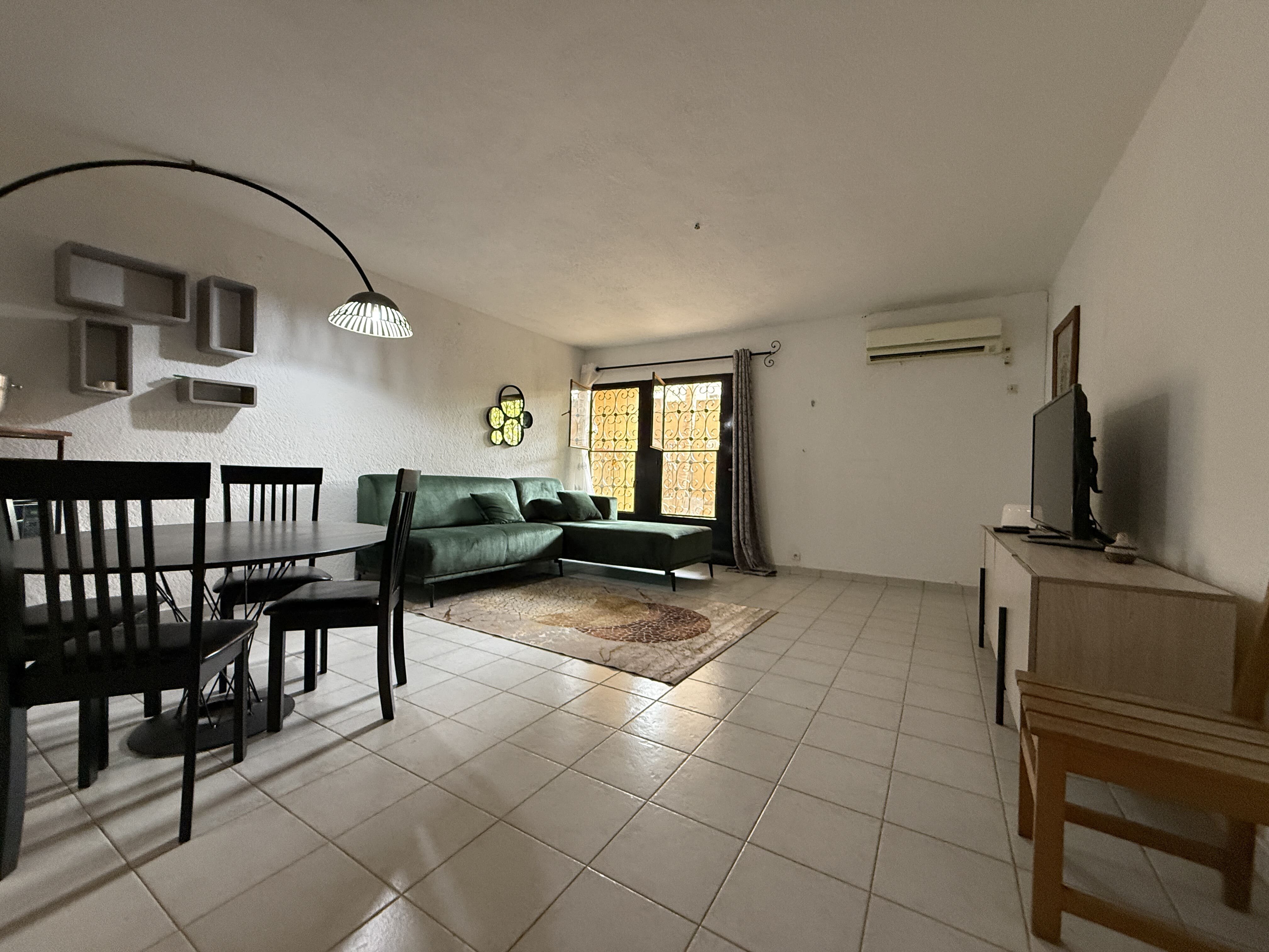 Un séjour avec cuisine américaine aménagée et équipée