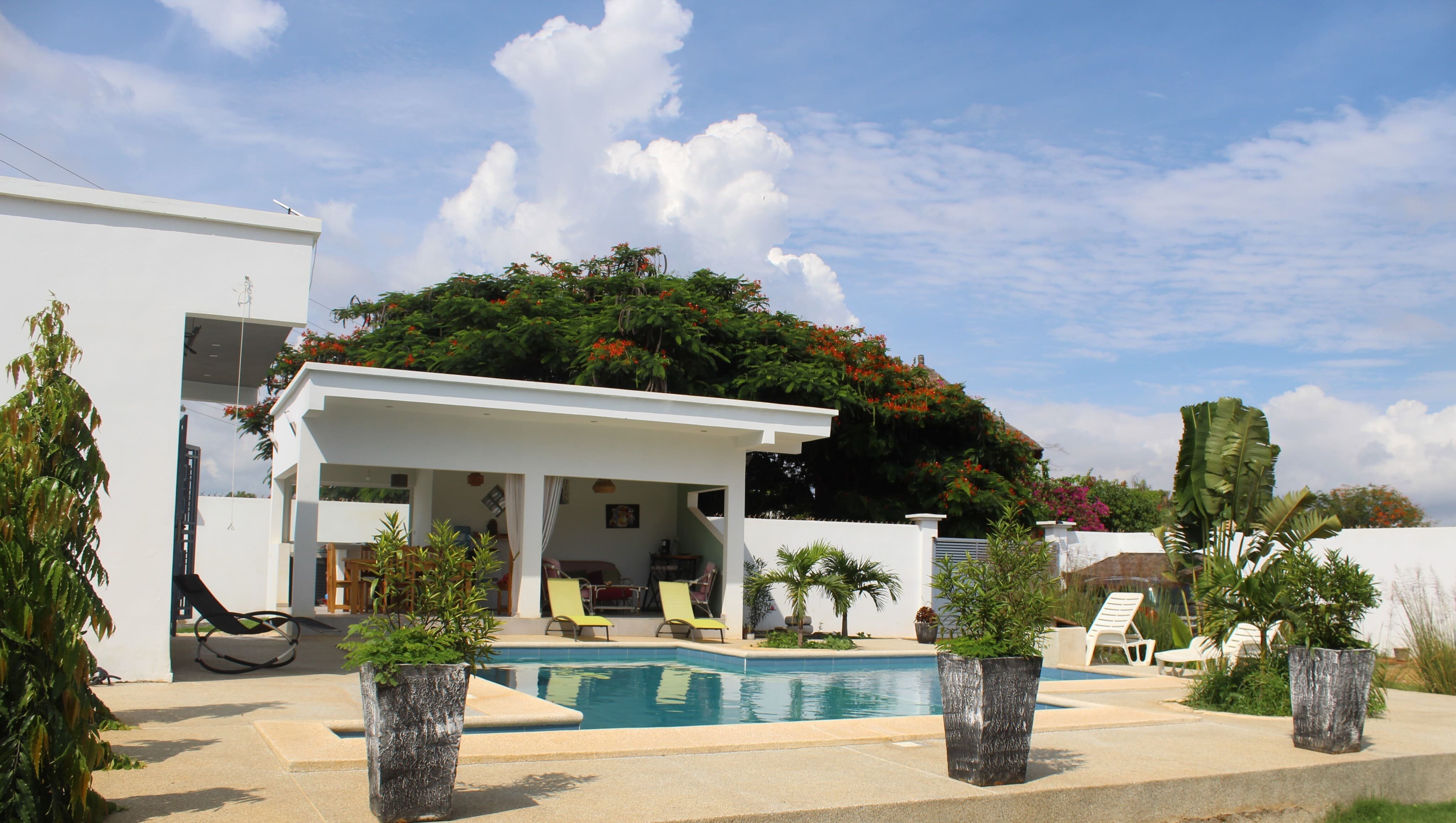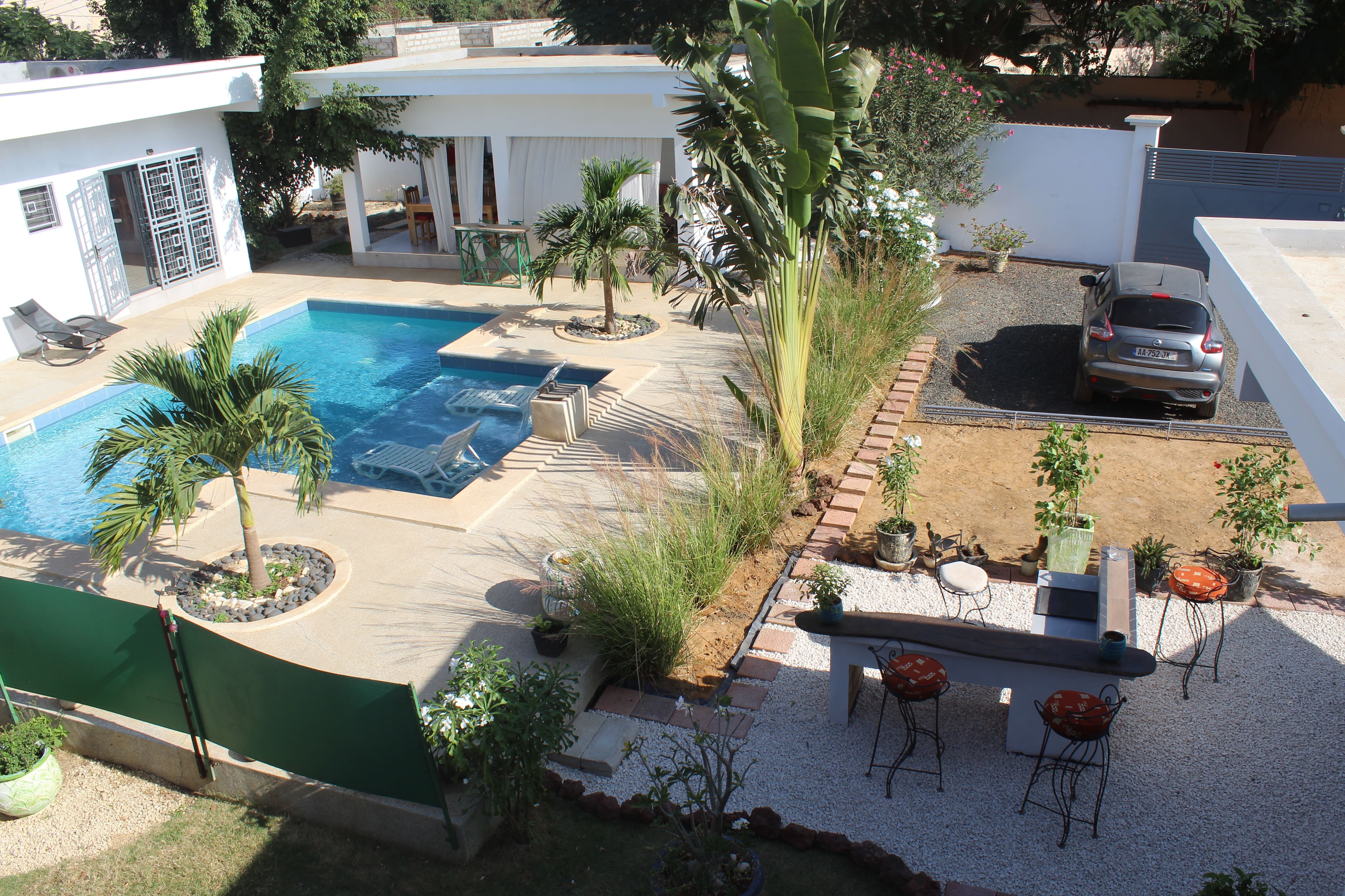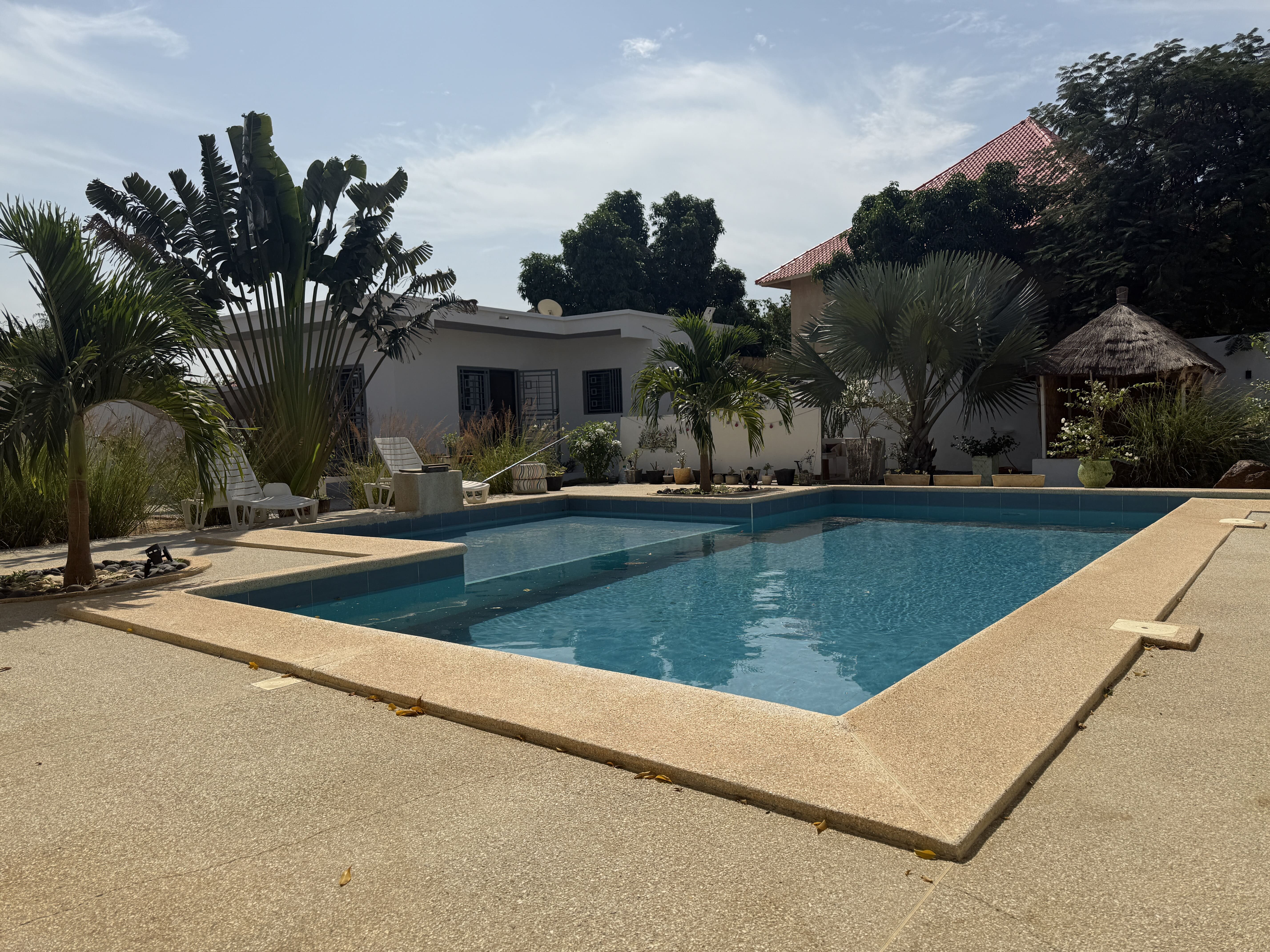Une belle piscine avec deux bassins, entourée de plusieurs petits espaces de détente très agréables
