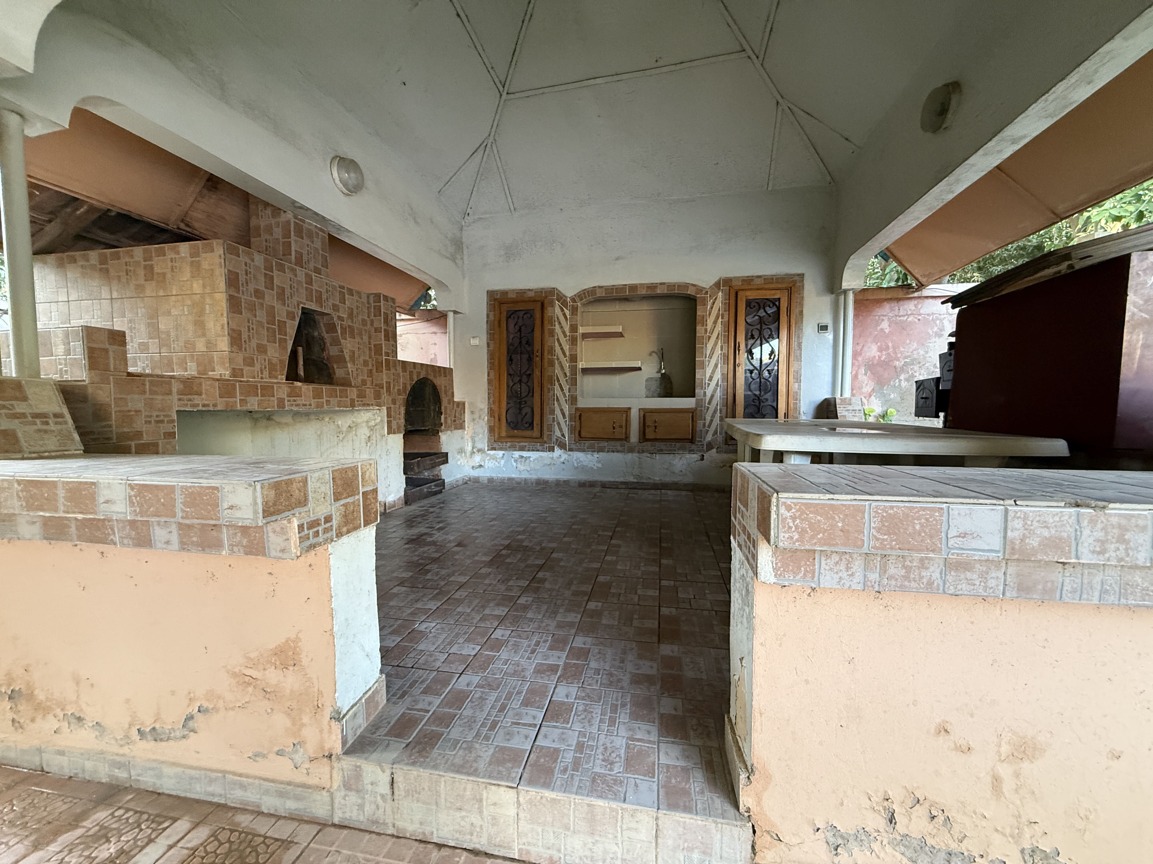 Une cuisine extérieure avec four à pizza et four à bois, un logement de gardien, un puits, une réserve d'eau, un surpresseur
