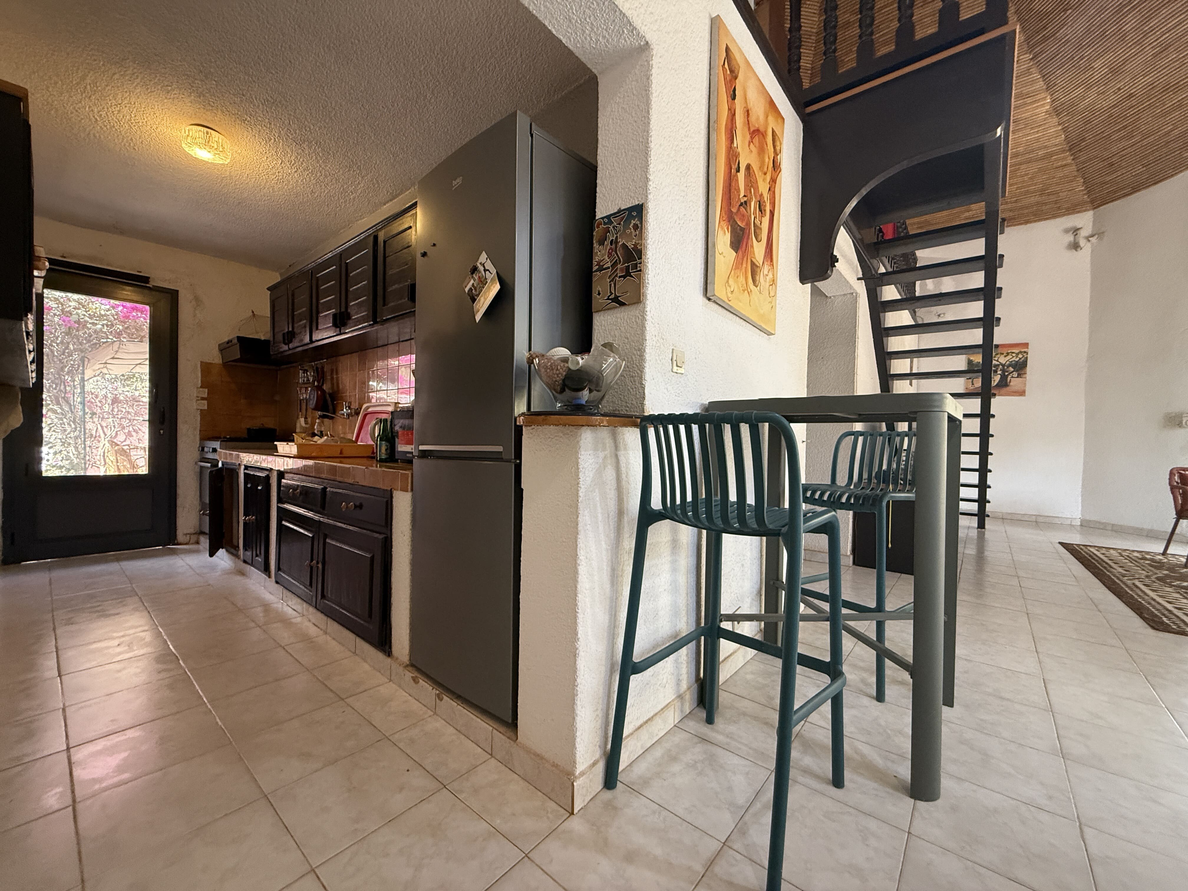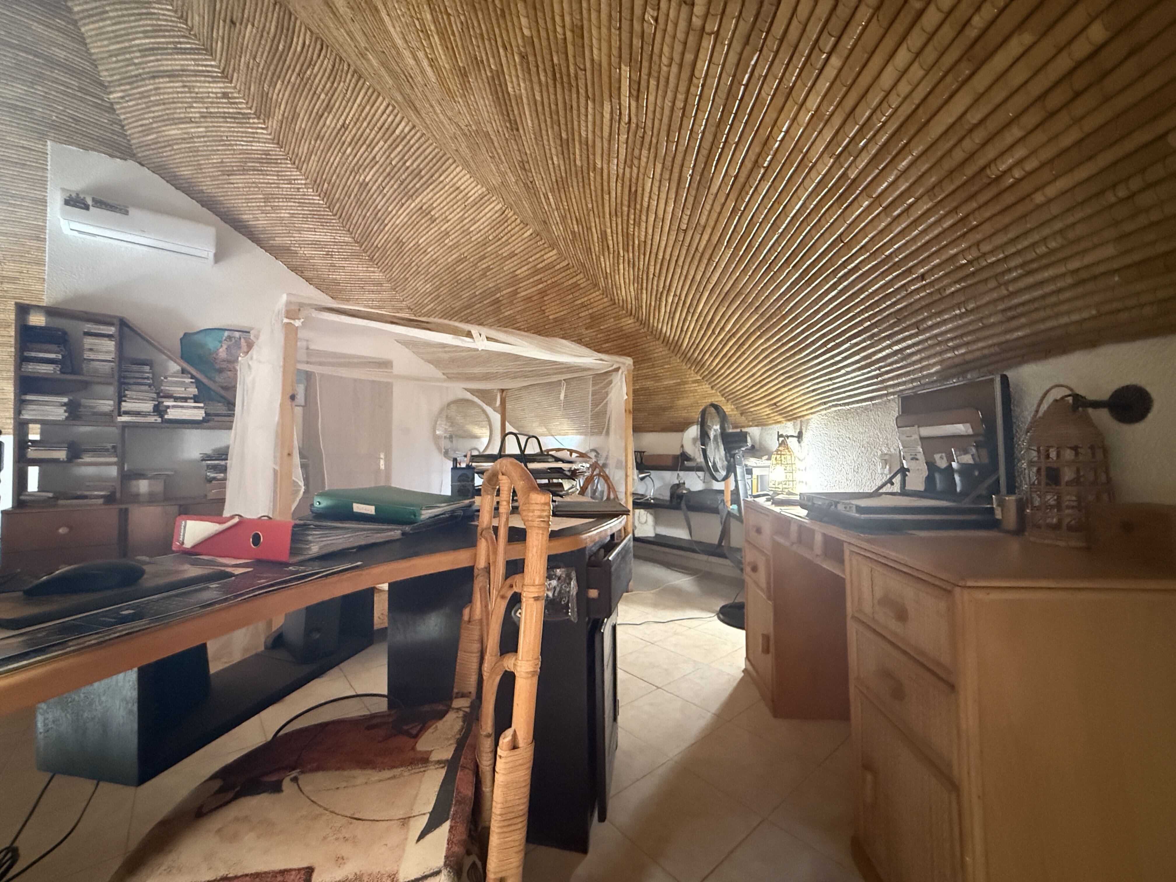 À l’étage, une grande mezzanine aménagée en chambre avec coin bureau, ainsi qu’une salle d’eau avec wc .