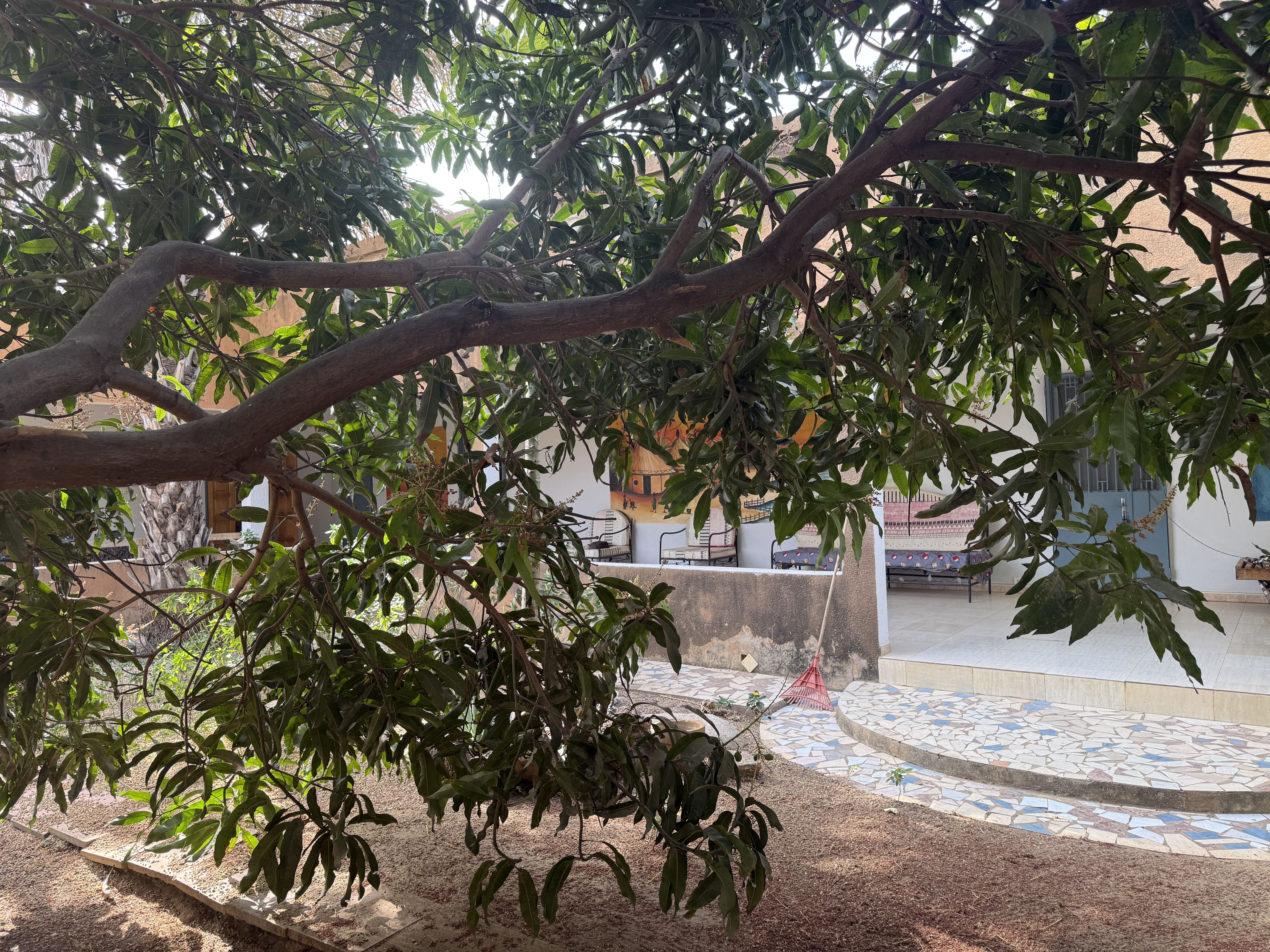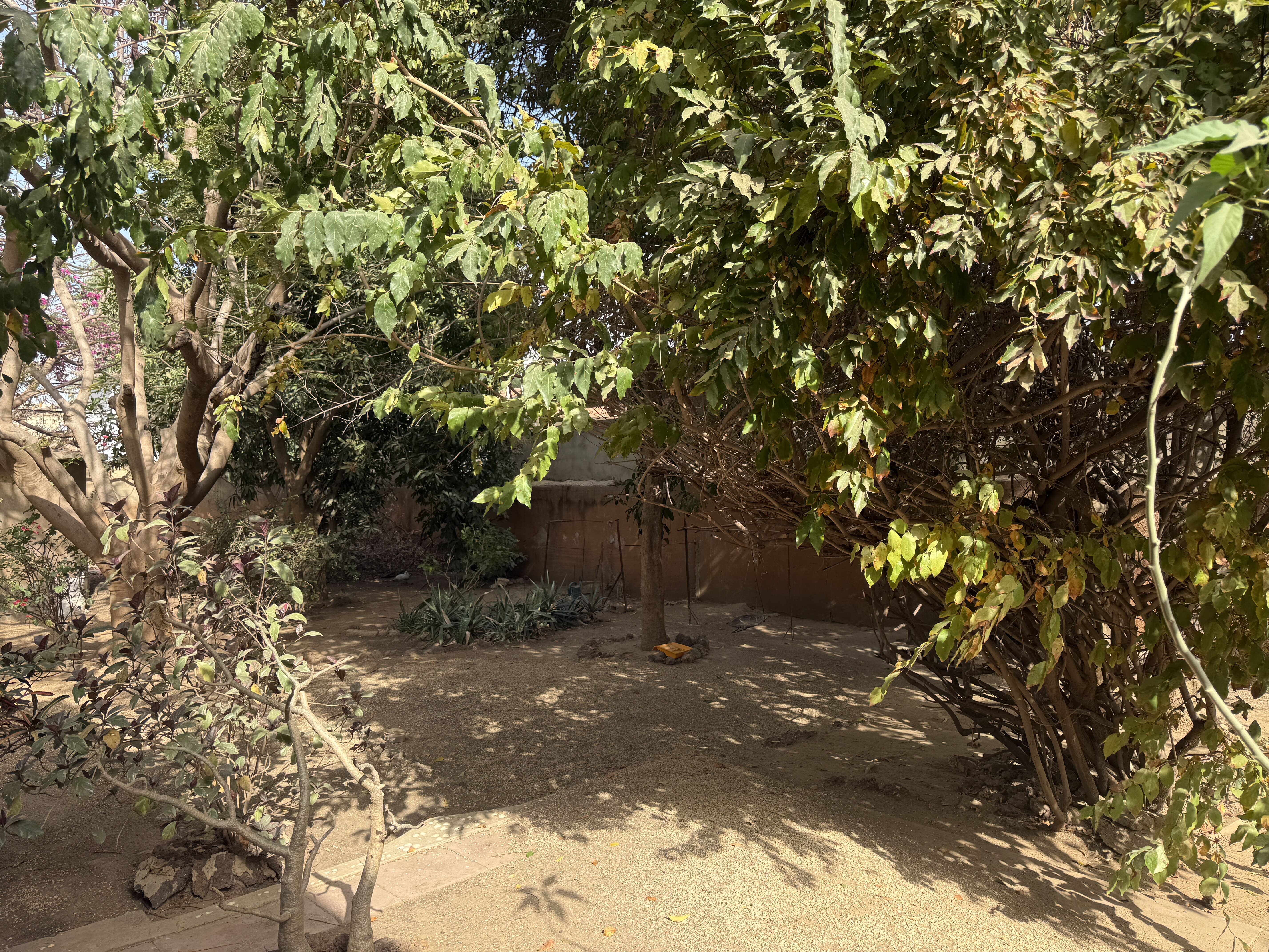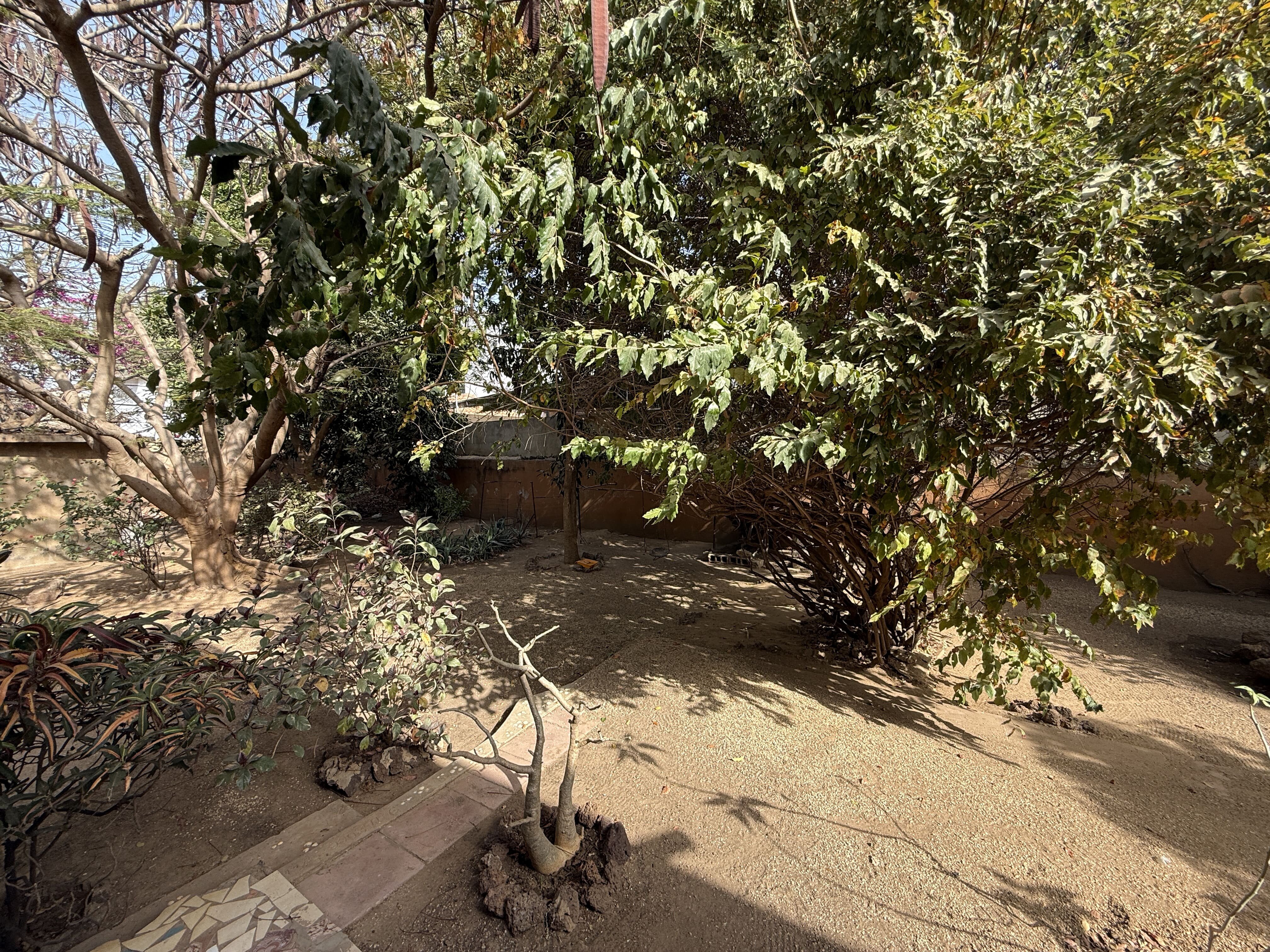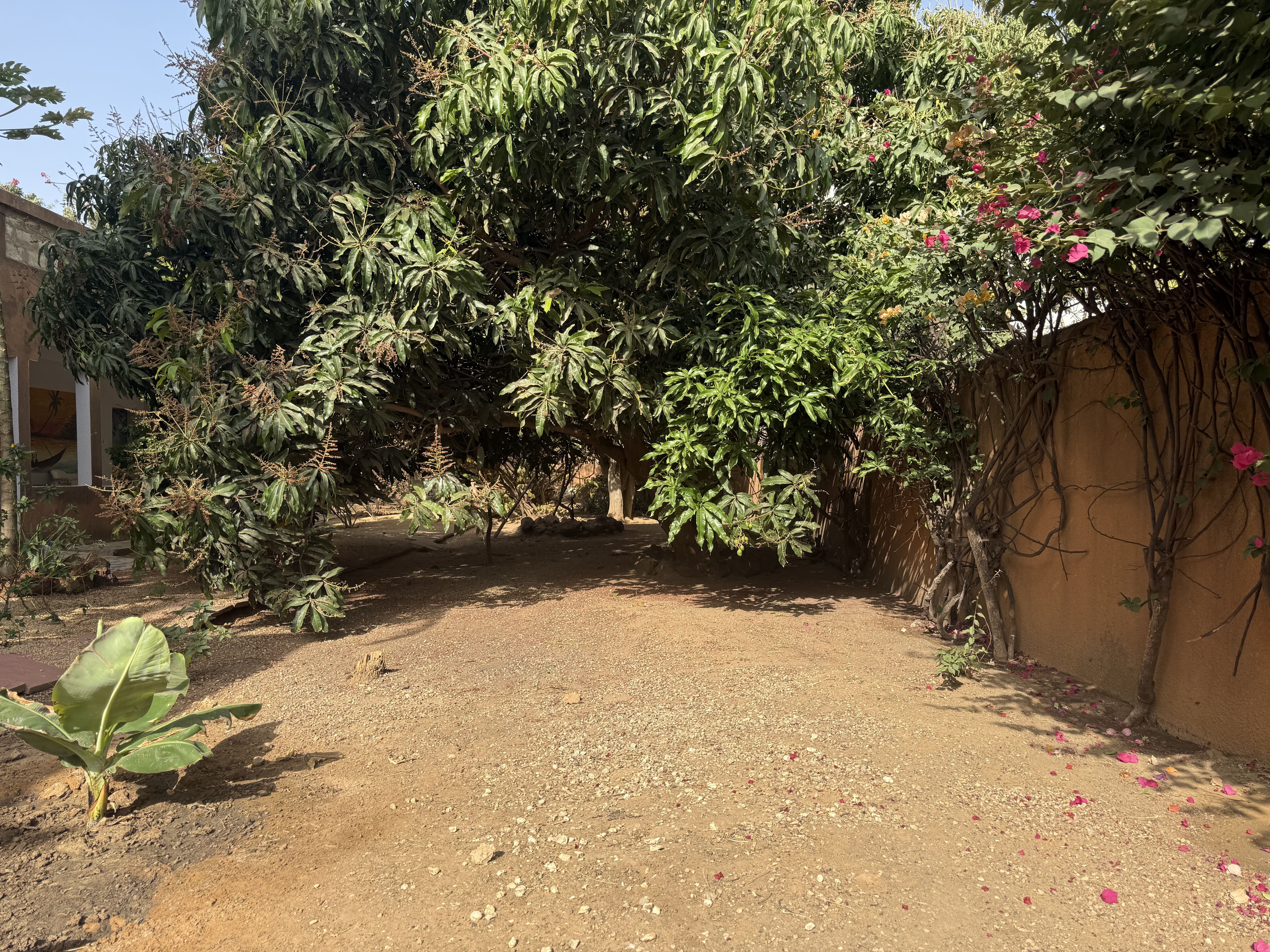 Un terrain spacieux et magnifiquement arboré avec de grands arbres fruitiers, notamment des manguiers.